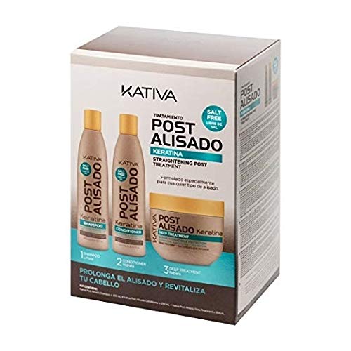 امنحي شعركِ العناية المثالية بعد التمليس مع مجموعة Kativa Post Alisado. تمتاز هذه المجموعة بتركيبة خالية من الأملاح والسلفات، مما يساعد على الحفاظ على نتائج التمليس لفترة أطول، مع ترطيب عميق ولمعان صحي.